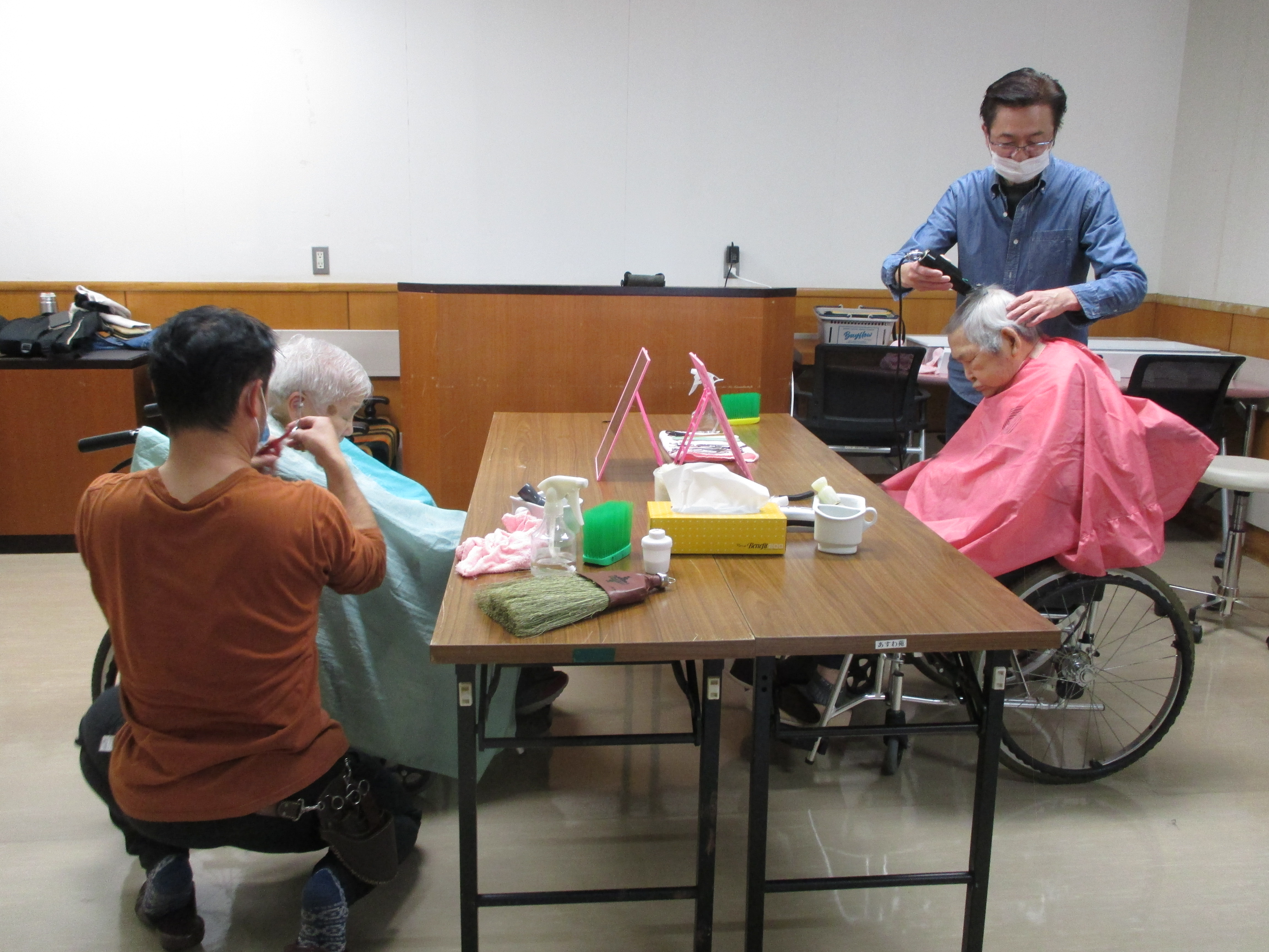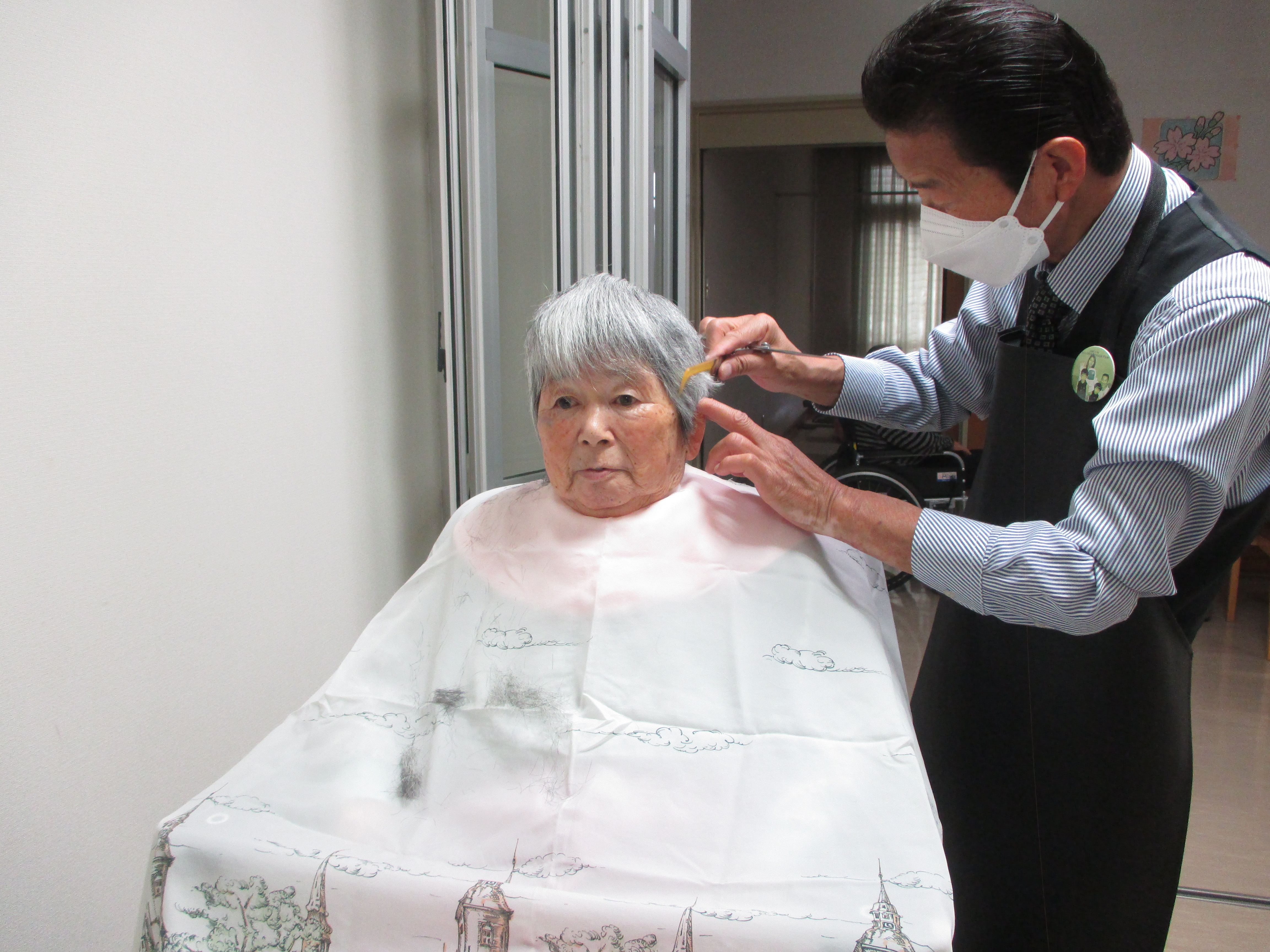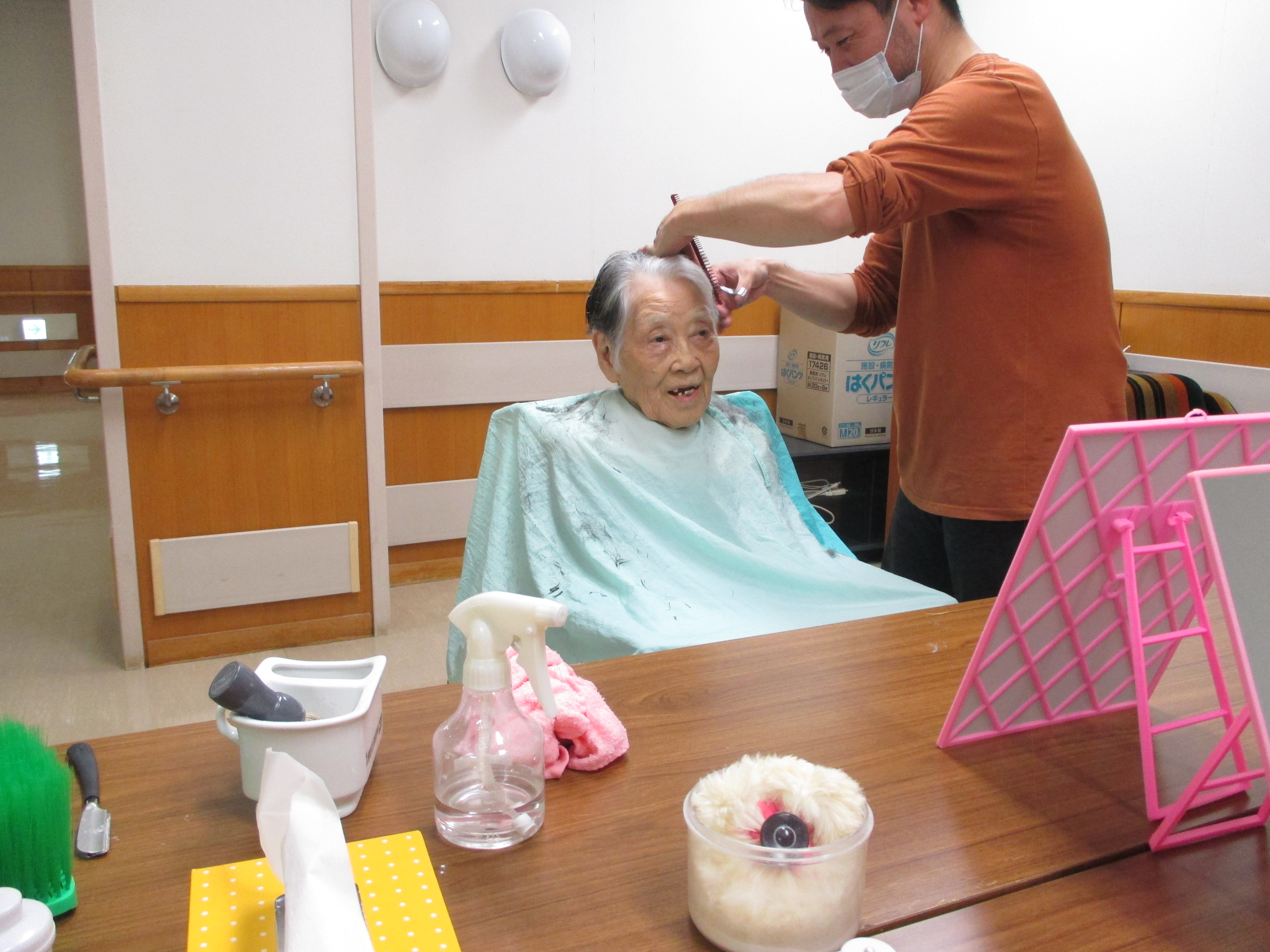 女性の方に「今日は美容師さんが来てくれたから髪をきれいに切ってもらえるよ」と声掛けすると、「本当!ありがたいわ、切ってもらいたい」と喜ばれます。