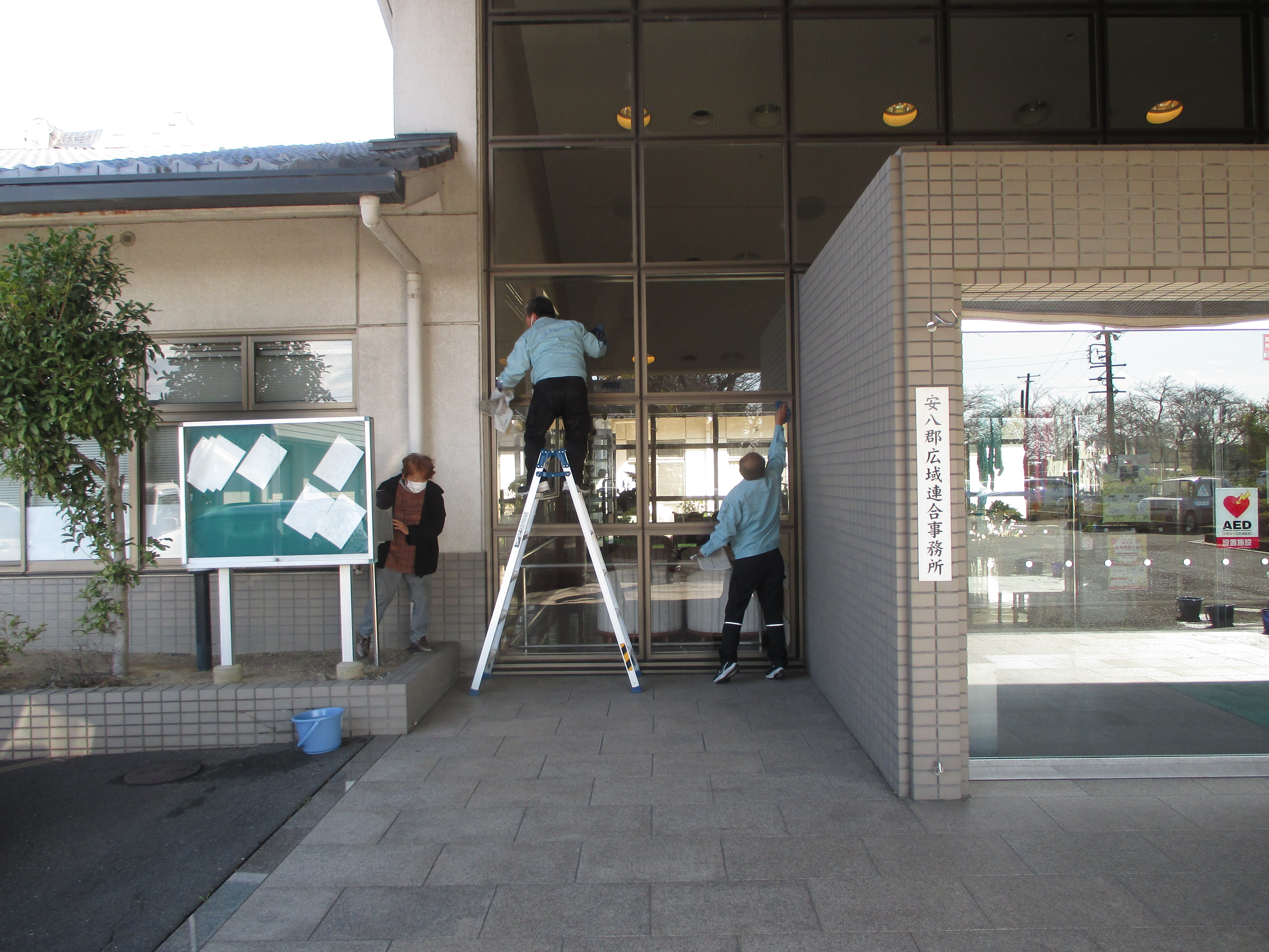 JAにしみの安八区域統括様、名森支店支店長様と助けあい組織の皆様で施設の顔である玄関付近の窓拭きと蜘蛛の巣の除去をしていただきました。