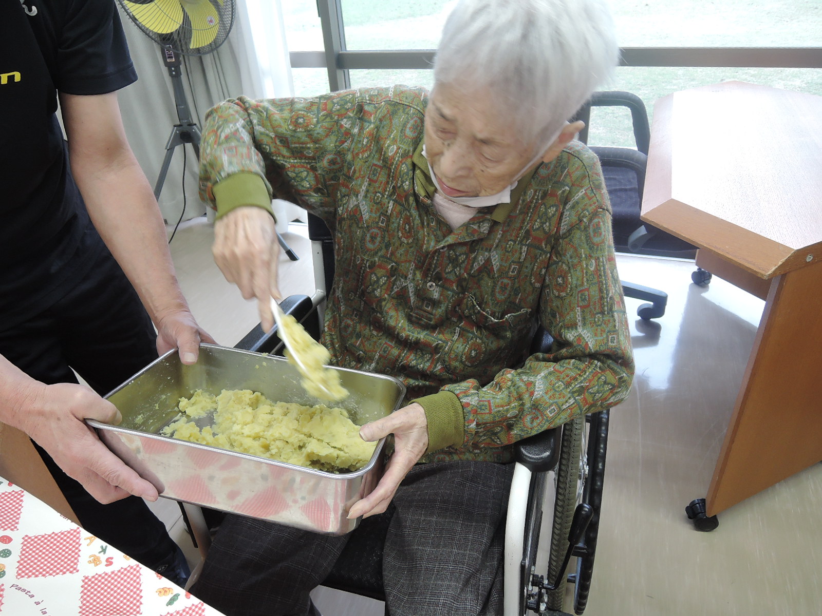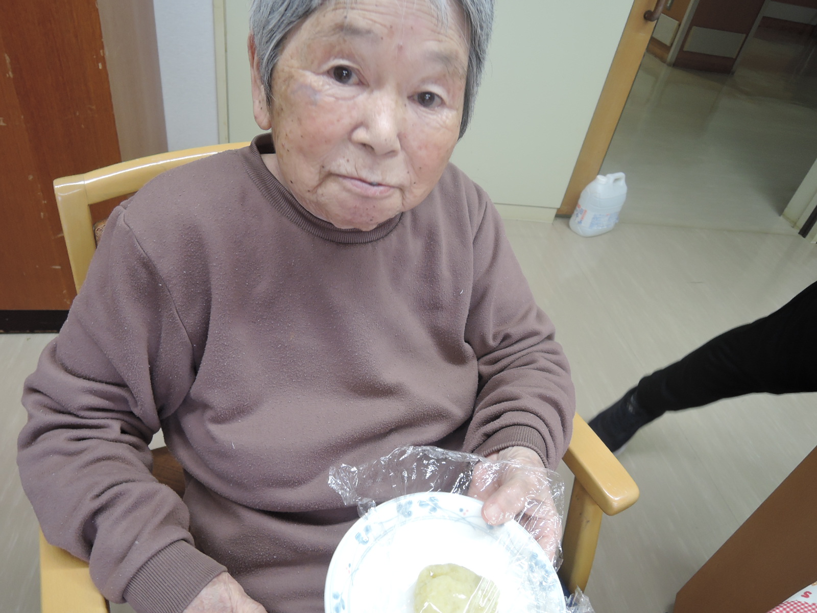 芋きんとん🍠美味しかったよ! 今日は、今が旬のサツマイモで芋きんとん作りをしました。 蒸したサツマイモに、たっぷりなバターと砂糖を練り込んで、栗きんとん風に形を作りました。 サツマイモとバター、砂糖を練り込む作業は思っていたよりも力が必要で大変でした。 皆さんで協力して練り上がった生地をサランラップで包んで形作りです。 上手に栗きんとん風に出来る方もみえれば、中には「サツマイモのおにぎり🍙みたいになっちゃった!」と笑ってみえる方もいました(笑) 「口の中に入れば一緒だからいいか」と美味しそうに召し上がられました(^^♪